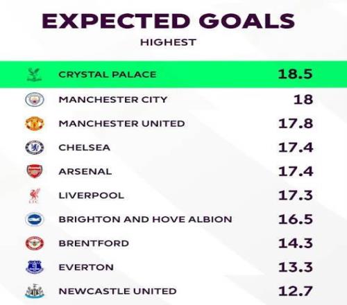 本赛季英超已经进行了10轮比赛,根据英超官方的统计数据,水晶宫是本赛季至今平均控球率第二低的球队,但他们的预期进球数最高。