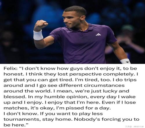 阿利亚西姆反对这种观点的理由是,除了“四处旅行,可以见识世界各地的不同文化”之外,这也是球员获取更多奖金的一种途径。再者,打球本来就是职业球员的一种工作,更不应该轻易说辛苦,“如果你想少参加比赛,那就待在家里,没人会强迫你来这里。”(来源:网球之家 作者:月亮河的星空)
