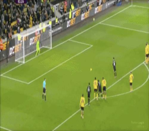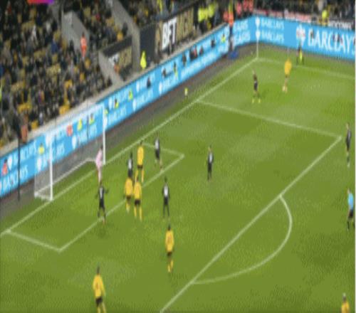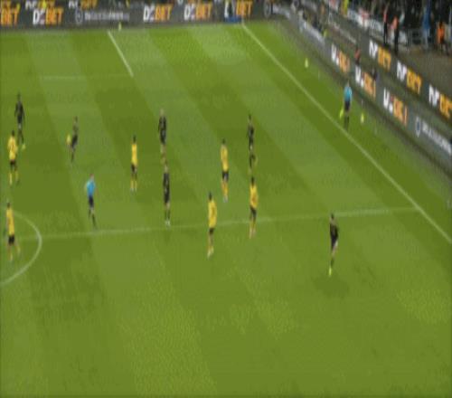 第45+2分钟,沃尔费禁区左侧倒三角传球,贝莱加德中路铲射破门,1-1!狼队扳平。