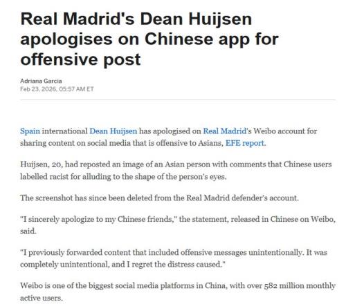 此外,西班牙COPE电台、《阿斯报》、《世界体育报》等媒体,也都关注赫伊森辱华事件,沙特媒体OKAZ也跟进报道。不过,皇马官方、赫伊森本人,都没有在全球平台发声道歉。